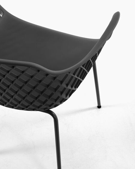 El asiento de Quinn es de plástico reciclable, con líneas redondeadas y un diseño tipo rejilla que crea un juego de luces y sombras. Además, se apoya sobre una estructura de metal con el mismo acabado. Disfrútala en interiores y exteriores.